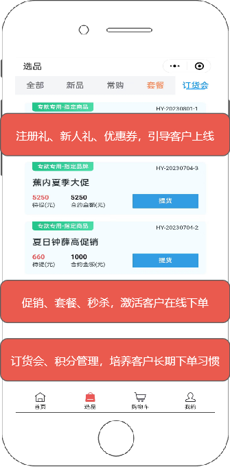 ·丰富的营销手段,特价、赠品、订货会、优惠券、团购等